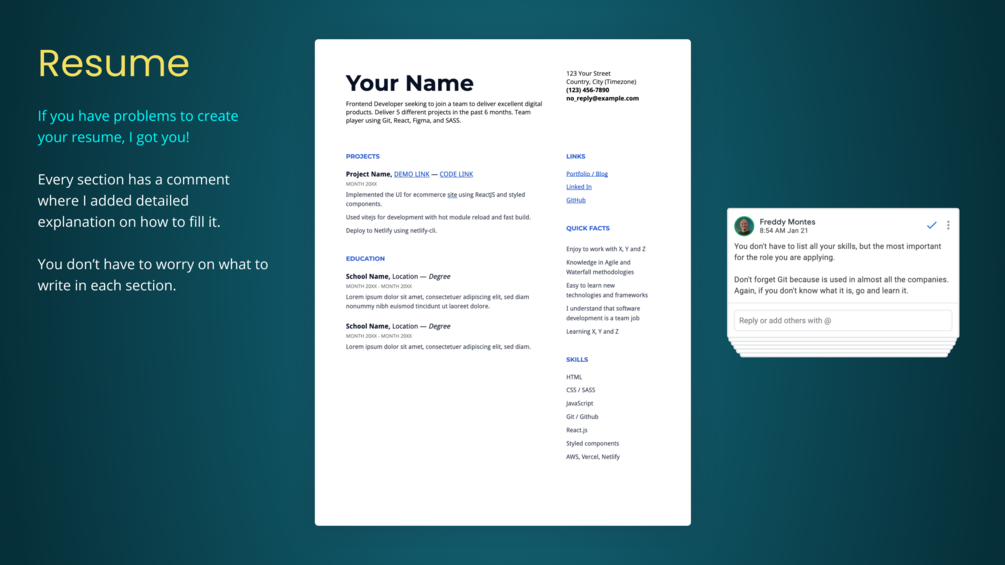 Portfolio design in a Figma file and Resume template in a document with comments.